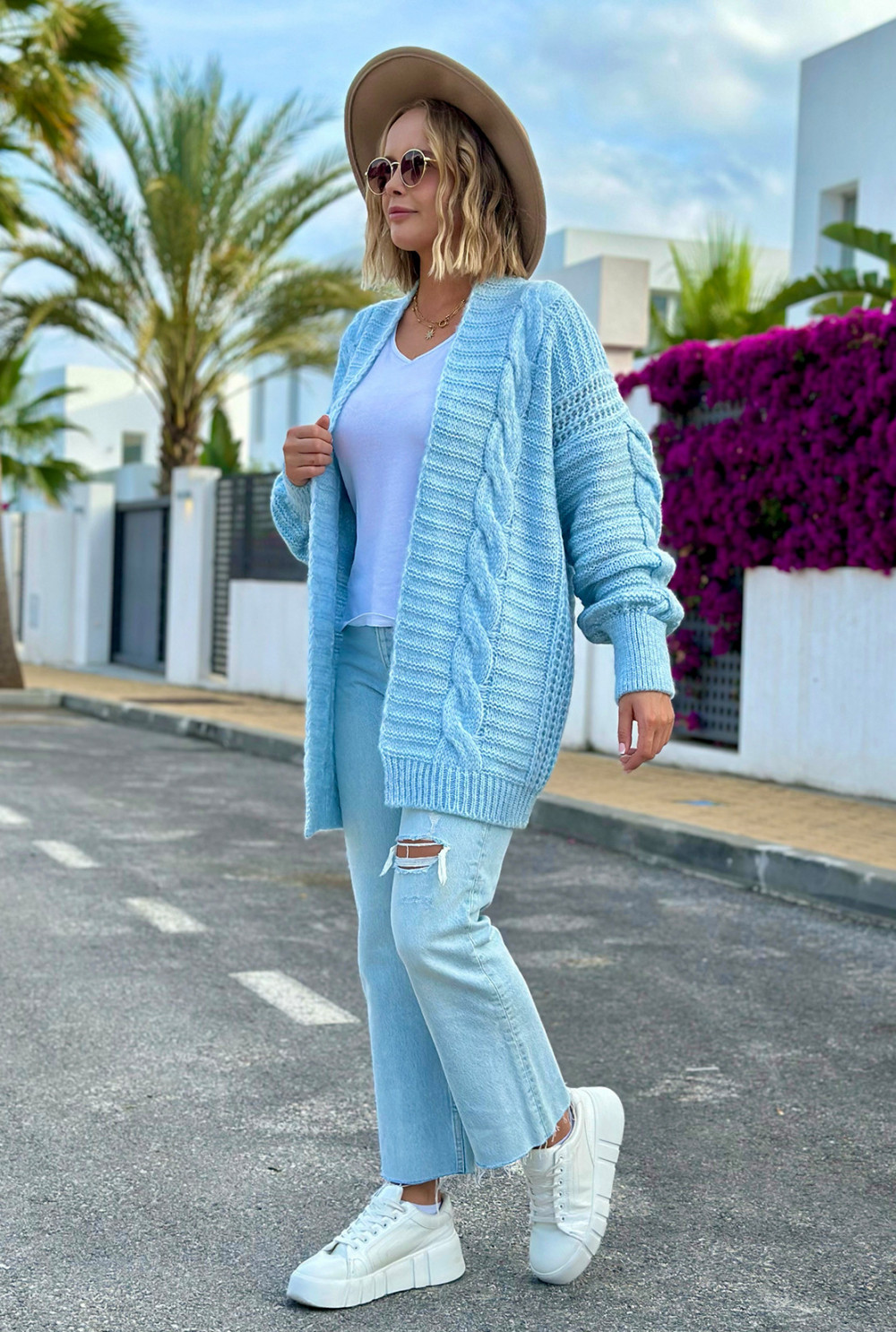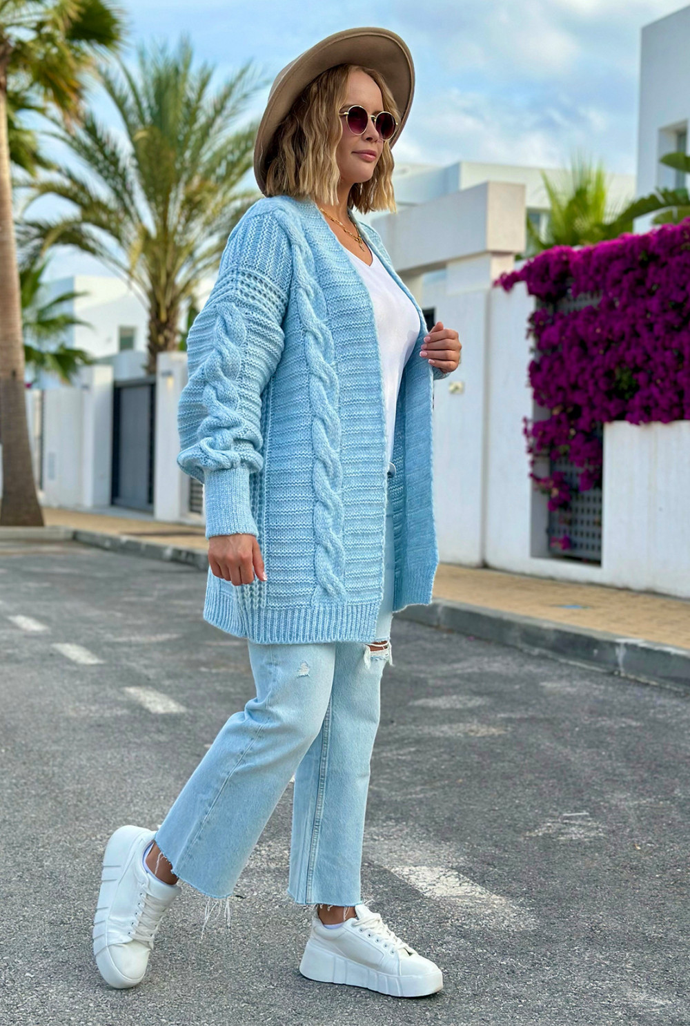 Kardigan z ozdobnym splotem. Model oversizowy o krótkim fasonie z bufiastymi rękawami, zakończonymi dłuższymi ściągaczami. Świetnie dopełni Twój look! Dostępny w wielu kolorach.