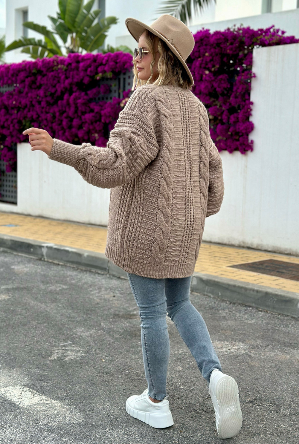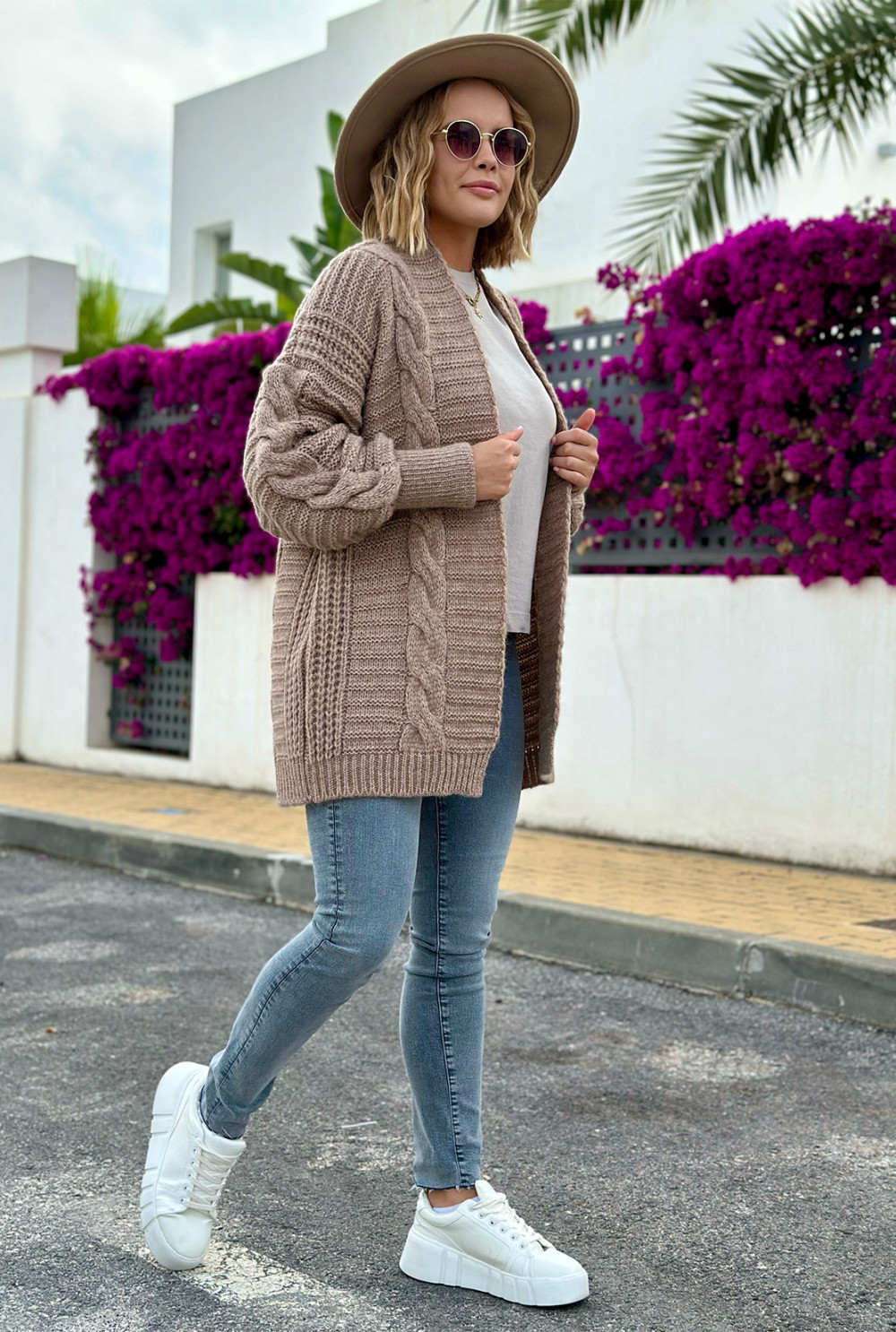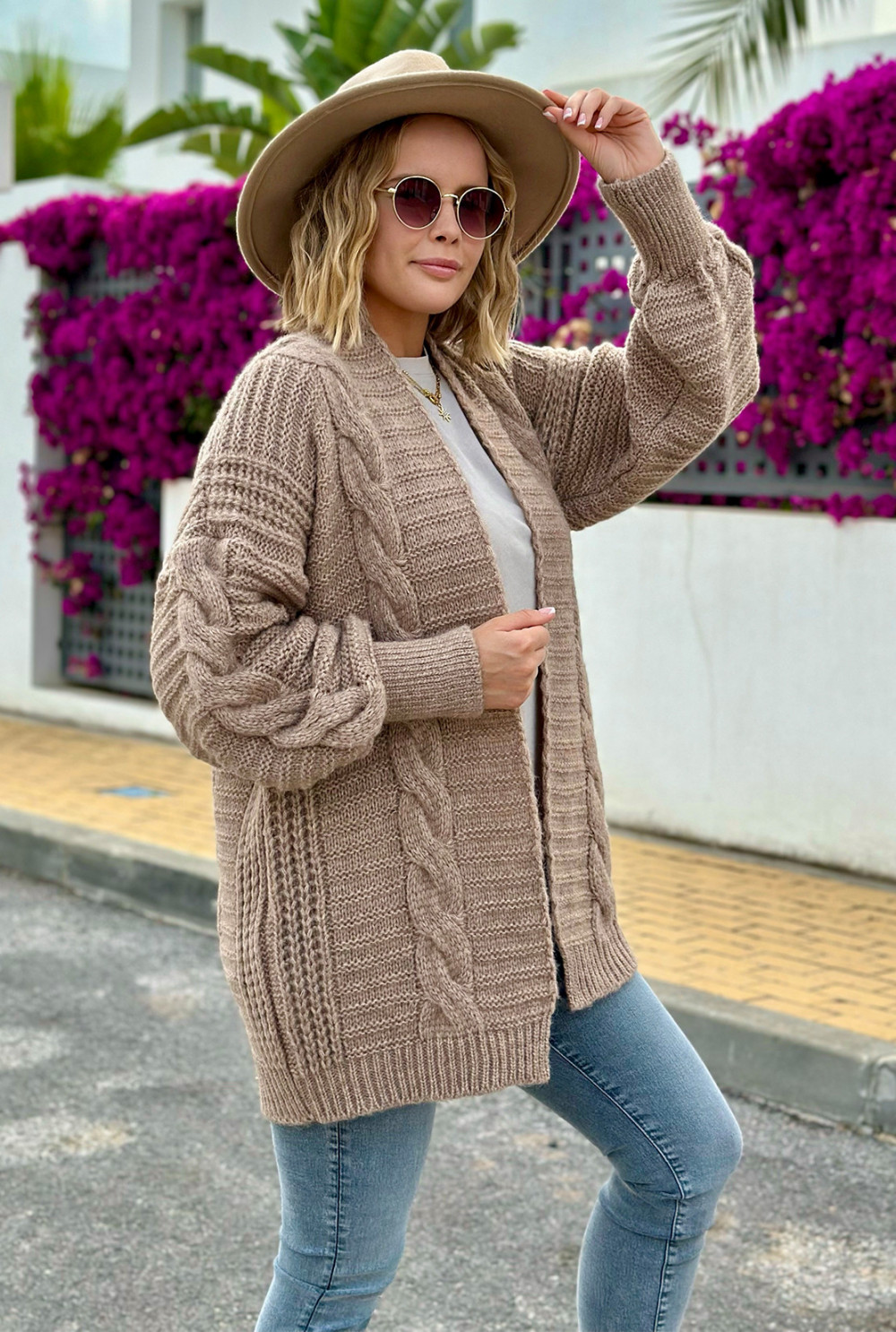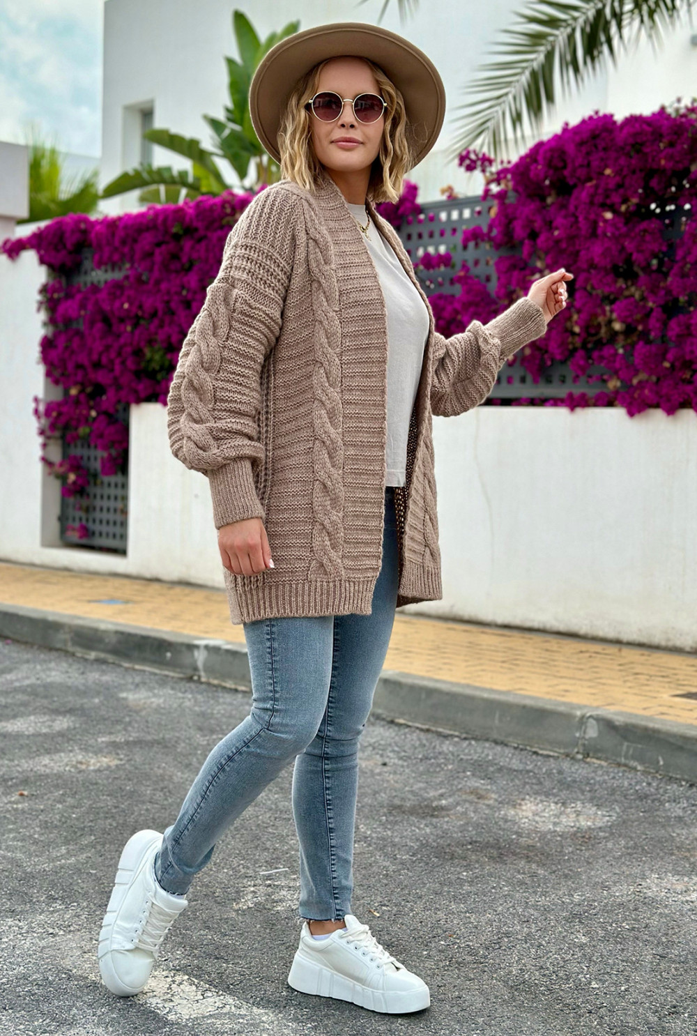 Kardigan z ozdobnym splotem. Model oversizowy o krótkim fasonie z bufiastymi rękawami, zakończonymi dłuższymi ściągaczami. Świetnie dopełni Twój look! Dostępny w wielu kolorach.