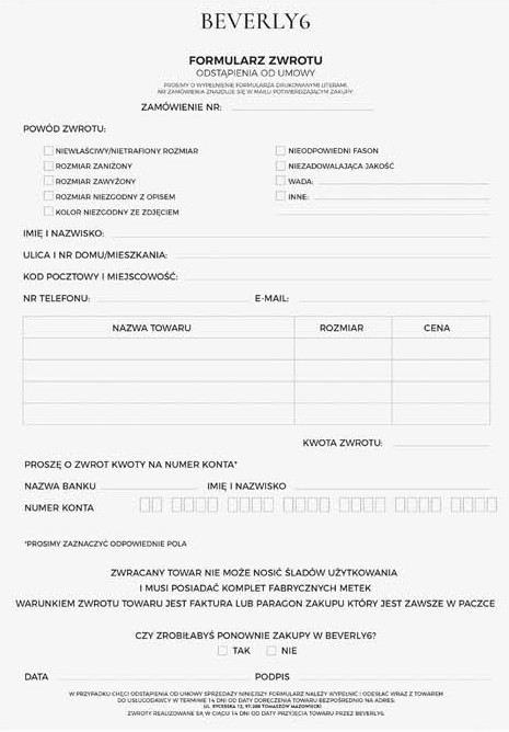 Od umowy możesz odstąpić, składając nam oświadczenie o odstąpieniu od umowy np. poprzez wiadomość e-mail przesłaną na adres: kontakt@beverly6.pl